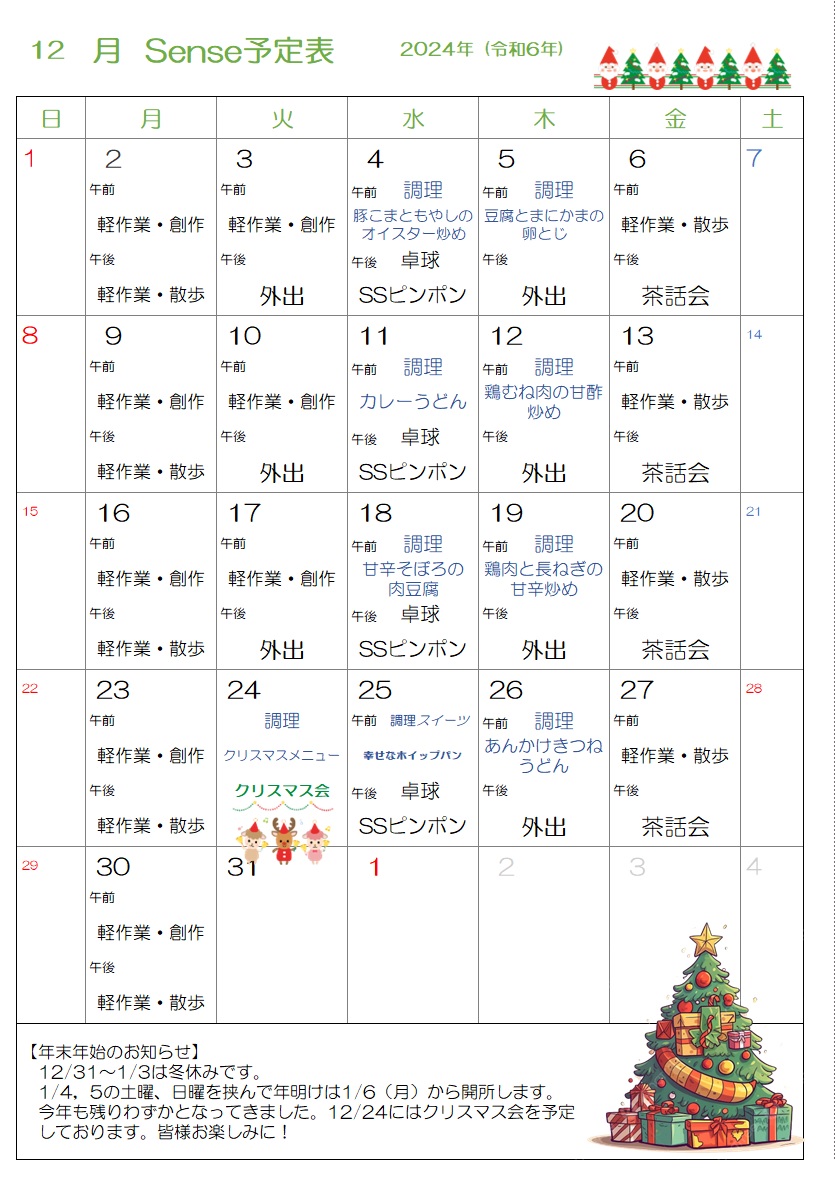 2024年12月のプログラム表です。 12月に入り冬の寒さを感じる日が増えてきました。例年と比べると暖かい日が多い様に感じます。 寒暖差が激しく体温調整が難しいですね。 最近は紅葉が一気に深まって良い景色が見られるなと感じております。 今月は12/24にクリスマス会を予定しておりますので、皆様お楽しみに。 体調に気を付けてお過ごしくださいね。