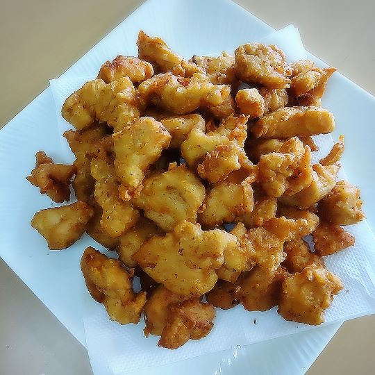 鶏の唐揚げは二度揚げし、表面はカラッと中はジューシーに仕上がりました♪