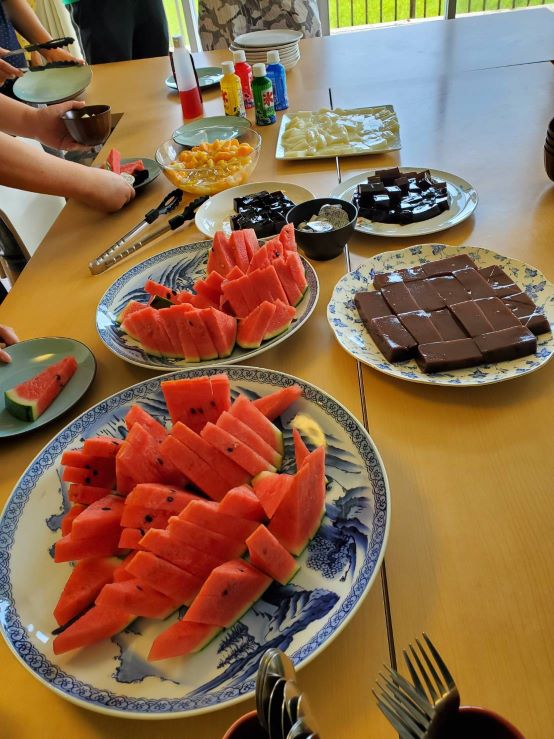 スイカ、かき氷、杏仁豆腐、水ようかん、コーヒーゼリー、フルーツミックスを皆さまに召し上がっていただきました。