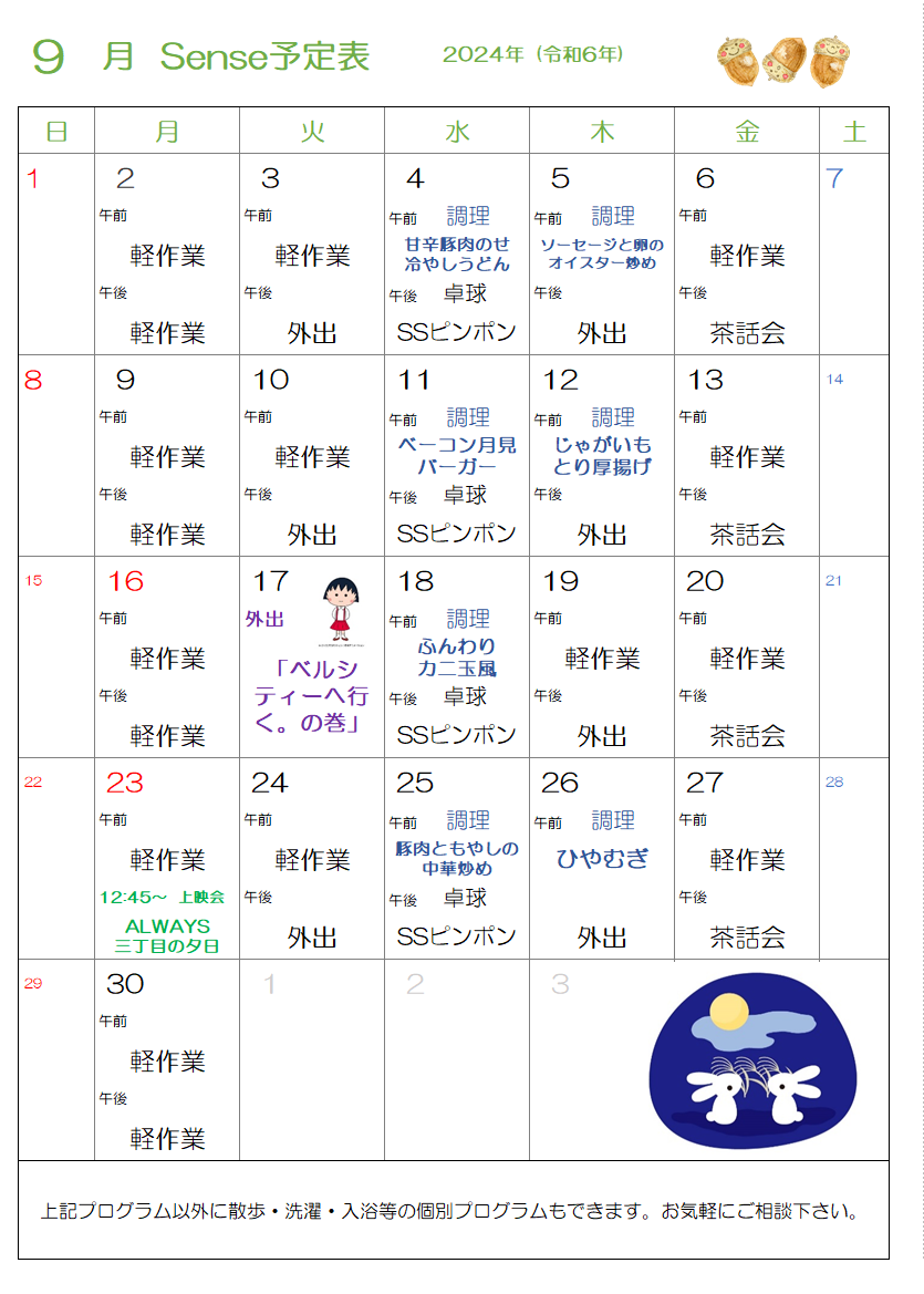 9月は17日にみんなで鈴鹿ベルシティへの外出・昼食会を企画しています。