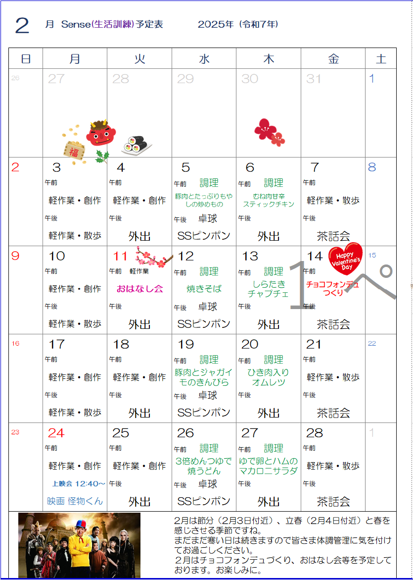 2025年1月以降のプログラム表ですが、自立訓練(生活訓練)と就労継続支援B型を分けて作成しました。