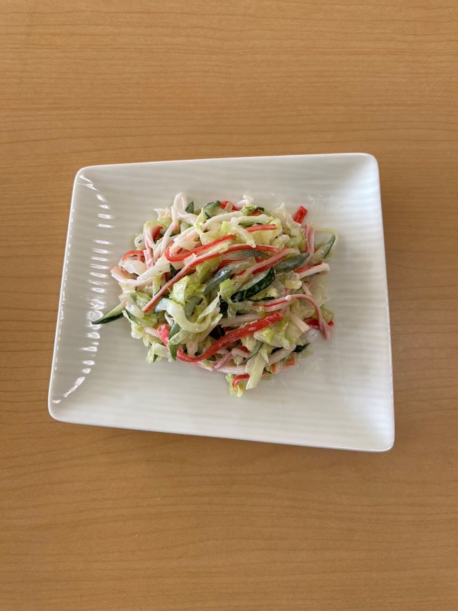 きゅうりとキャベツを細切りし、塩もみしたうえで砂糖とマヨネーズを加え、カニカマと和えました。