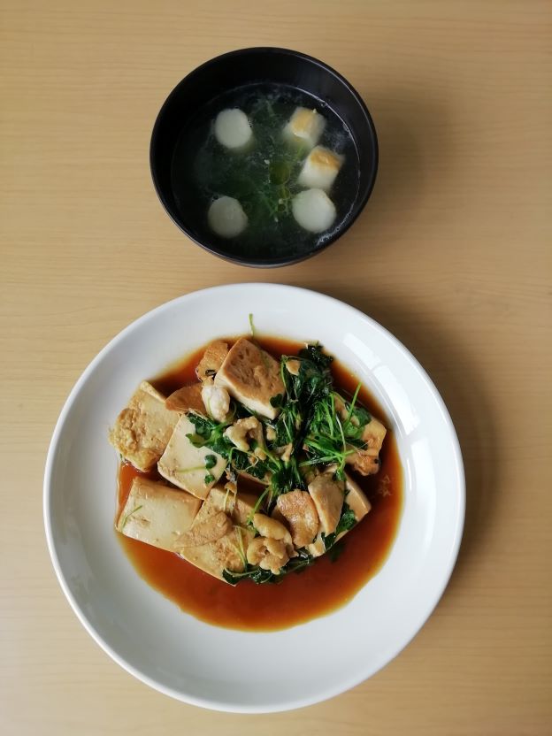 豆腐、鶏むね肉、豆苗を使った高たんぱくで低カロリーかつ安価で作れるおススメのメニューです。